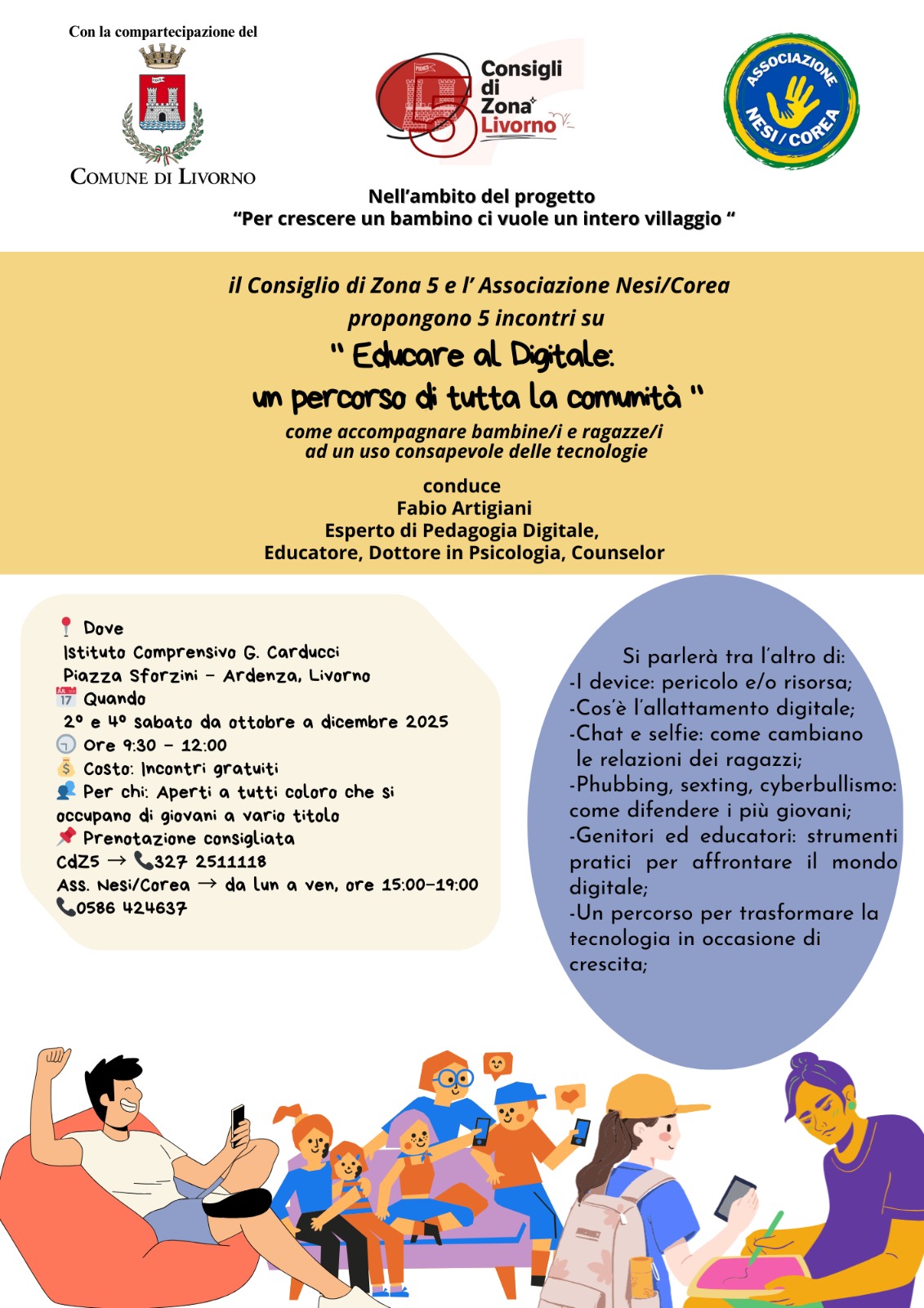 Il Consiglio di Zona 5 e l’Associazione Nesi/Corea propongono cinque incontri su “Educare al digitale, un percorso di tutta la comunità”. Come accompagnare bambini/e e ragazzi/e a un uso consapevole delle nuove tecnologie. Conduce Fabio Artigiani, esperto in Pedagogia Digitale, Educatore, Dottore in Psicologia e Counselor. LOCANDINA