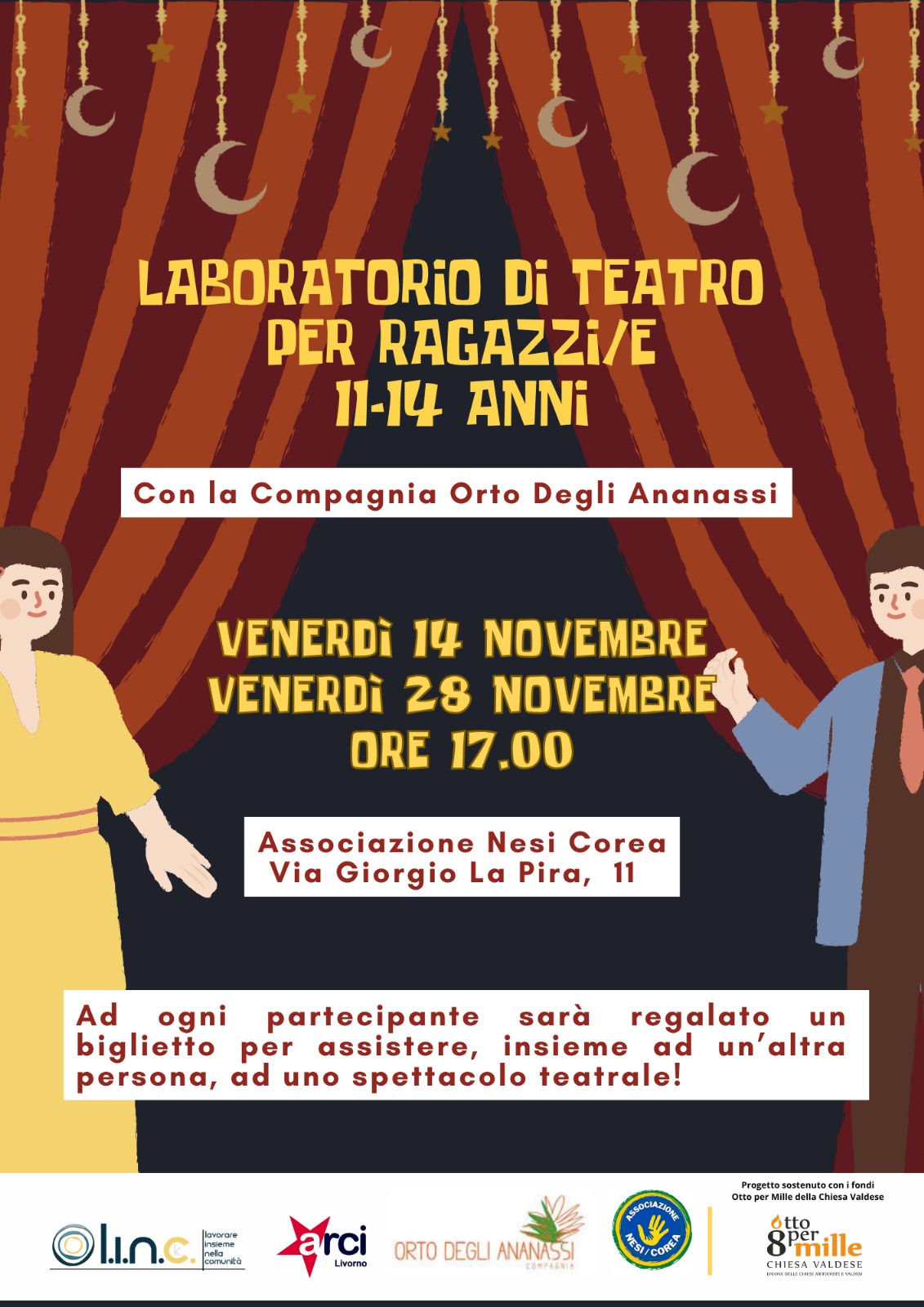 I laboratori teatrali del progetto DOPO LA SCUOLA. L’ARTE ritornano negli spazi dell’Associazione grazie alla compagnia ORTO DEGLI ANANASSI, questa volta rivolti alla fascia dagli 11 anni in su. a tutte/tutti i/le partecipanti saranno consegnati i biglietti per partecipare gratuitamente ad alcuni spettacoli di teatro per le nuove generazioni. Progetto realizzato grazie al contributo dell’8xmille