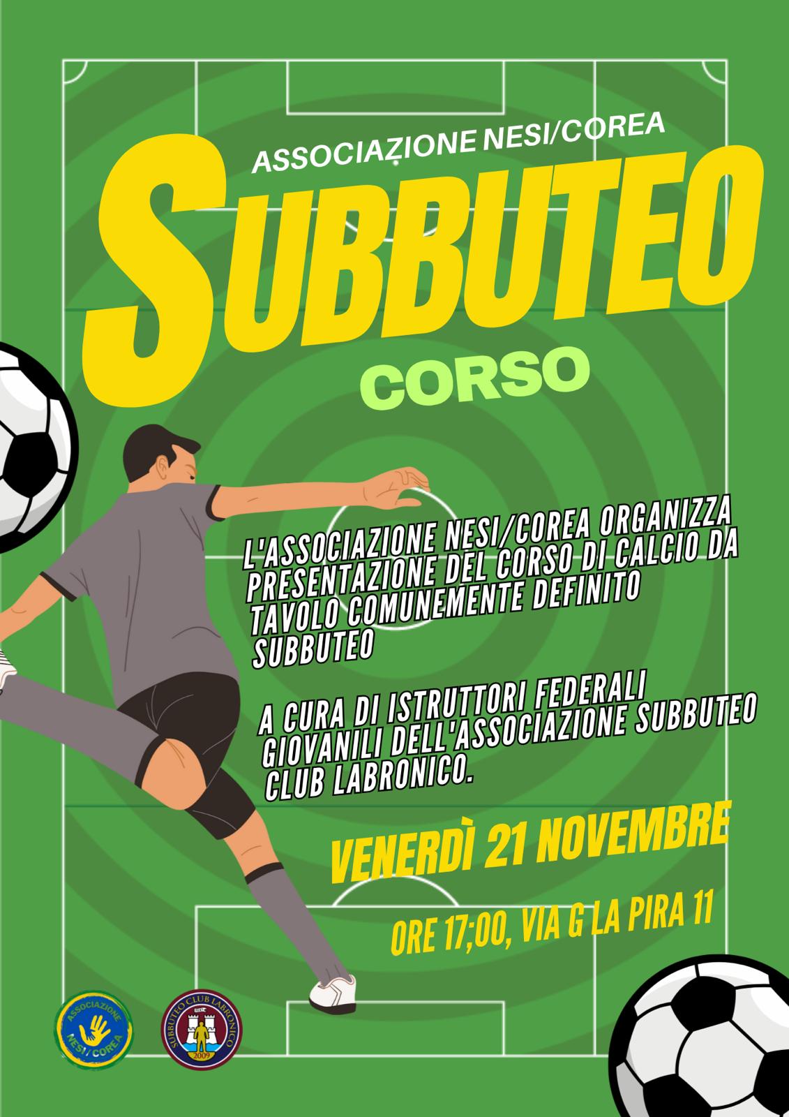 L’Associazione Nesi Corea organizza la presentazione del corso di Calcio da Tavolo, comunemente conosciuto come Subbuteo. A cura di istruttori federali giovanili dell’associazione Subbuteo Club Labronico. Venerdì 21 novembre alle 17.00, Via G. La Pira 11 LOCANDINA