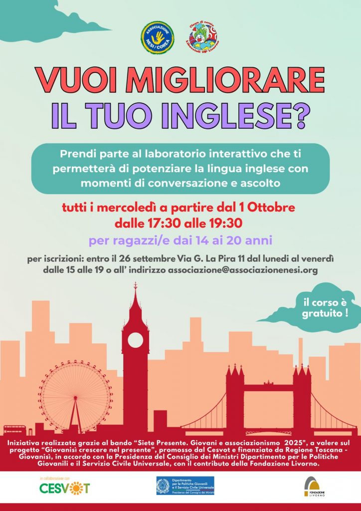 - laboratorio di conversazione e di ascolto della lingua inglese per ragazzi/e dai 14 ai 20 anni. Si terrà tutti i mercoledì, a partire dal 1 ottobre, dalle 17.30 alle 19.30.