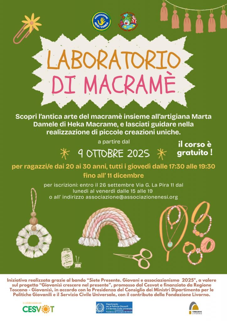 - laboratorio di macramè per ragazzi e ragazze dai 20 ai 30 anni. Si terrà tutti i giovedì a partire dal 9 ottobre dalle 17,30 alle 19,30. Insieme all’artigiana Marta Damele saranno realizzate piccole creazioni uniche attraverso l’arte tessile decorativa che consiste nell’annodare fili.