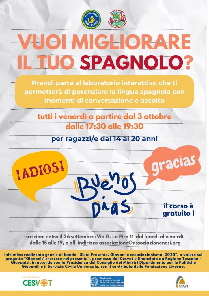 - laboratorio di conversazione e ascolto della lingua spagnola per ragazzi/e dai 14 ai 20 anni. Si terrà tutti i venerdì, a partire dal 3 ottobre, dalle 17.30 alle 19.30.