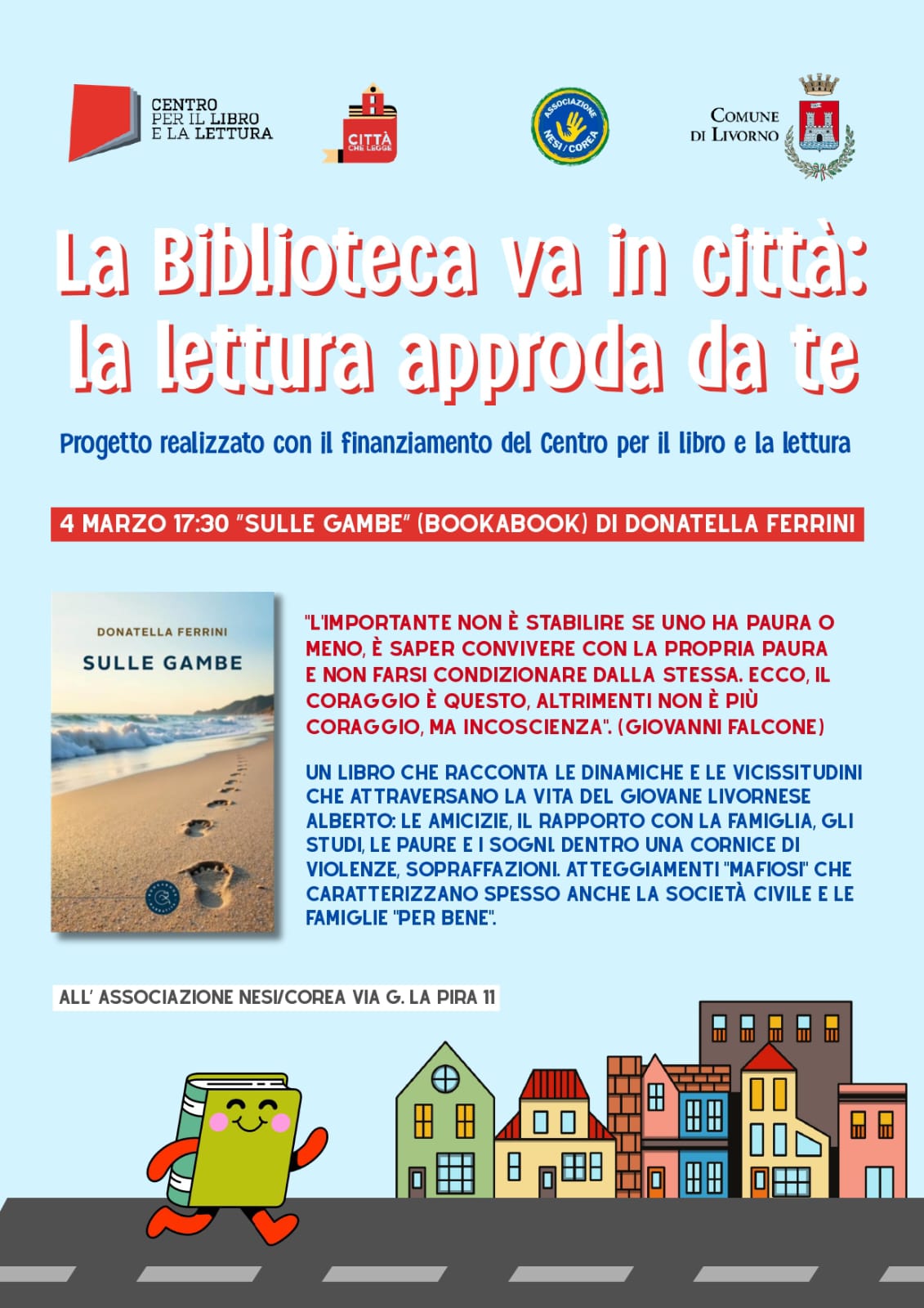 Mercoledì 4 marzo all’Associazione Nesi/Corea alle 17,30 presentazione del libro “Sulle gambe” di Donatella Ferrini. Storia di Alberto, livornese che vive con la famiglia a Verona, costretto a subire atti pesanti di bullismo e violenze per molti anni, fin da piccolo. Il viaggio a Palermo e la visita all’Albero di Falcone cambieranno la sua vita