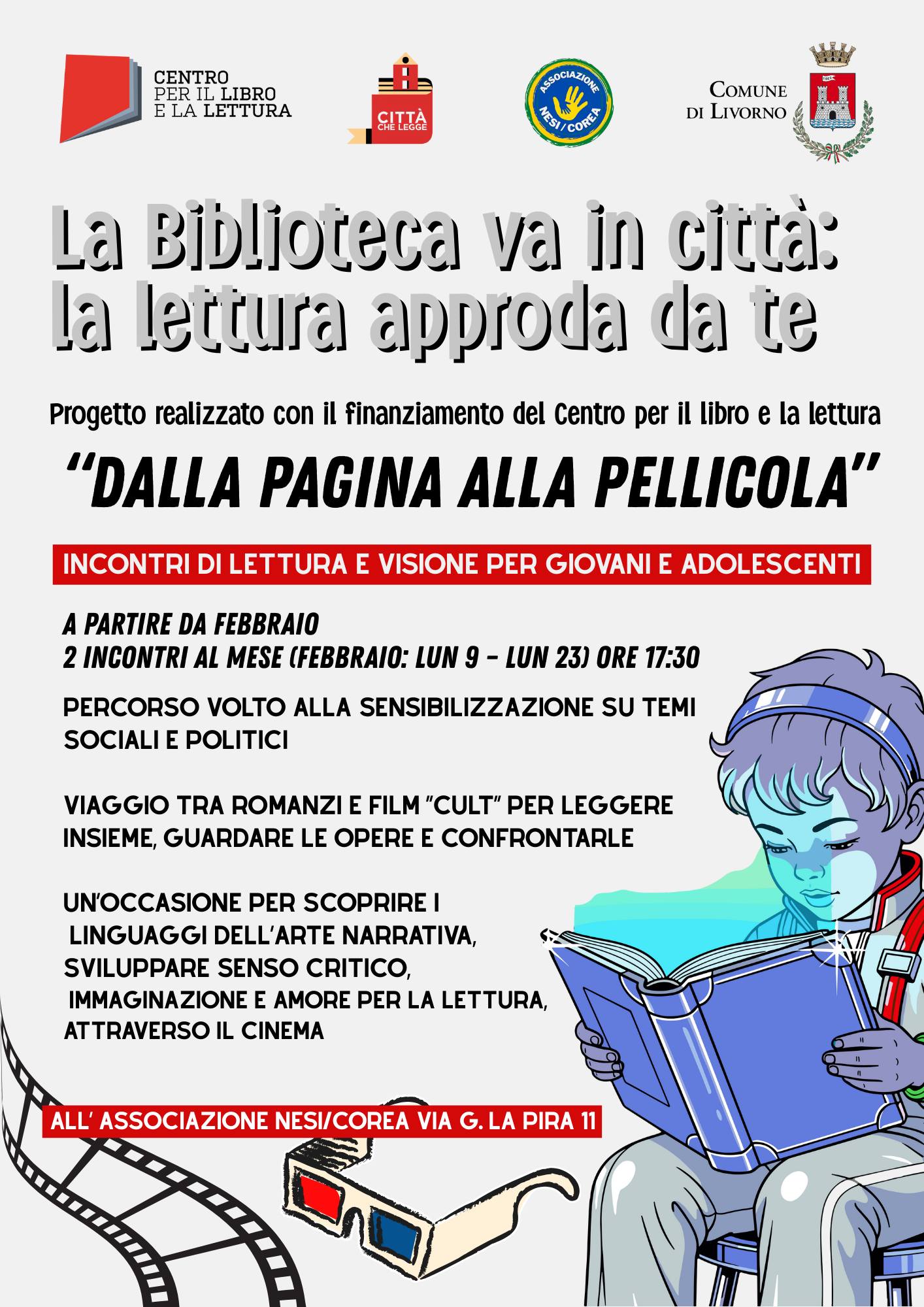 Dalla pagina alla pellicola.Un nuovo laboratorio all’Associazione Nesi/Corea che unisce il cinema e la letteratura. Vedremo assieme alcuni film e leggeremo brani di romanzi dai quali sono stati tratti quei film. Il percorso è destinato ai ragazzi e alle ragazze dai 14 anni ai 20 anni. Fa parte del progetto “La biblioteca va in città: la