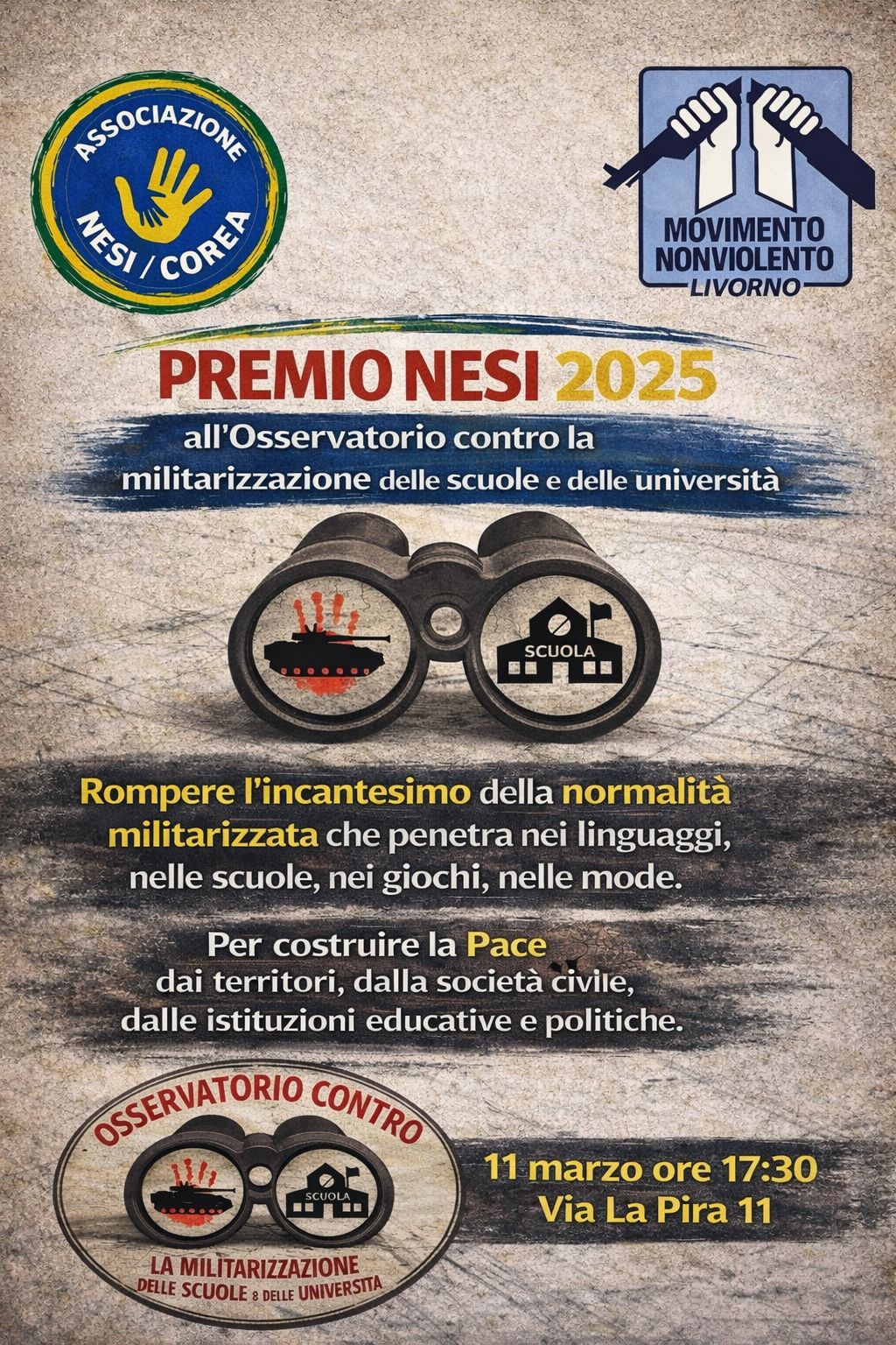 L’Associazione Nesi/Corea e il Movimento Nonviolento di Livorno organizzano, mercoledì 11 marzo alle 17,30 in via La Pira 11, un incontro con l’Osservatorio contro la militarizzazione delle scuole e delle Università al quale sarà conferito anche il “Premio Nesi” 2025. La cerimonia di premiazione sarà seguita da un incontro aperto sul tema della militarizzazione che