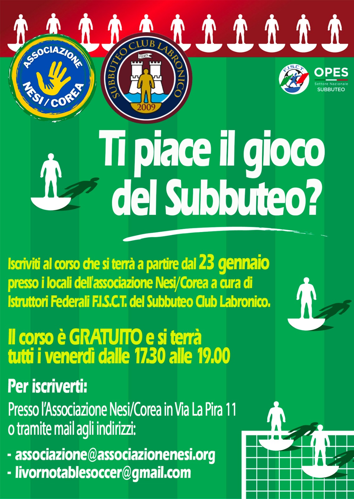 Dal 23 gennaio all’ Associazione Nesi/Corea e a cura del Subbuteo Club Labronico (con istruttori federali) parte un corso di Subbuteo.Il corso è gratuito.Per informazioni e iscrizioni scrivere alle email indicate nel volantino. VOLANTINO