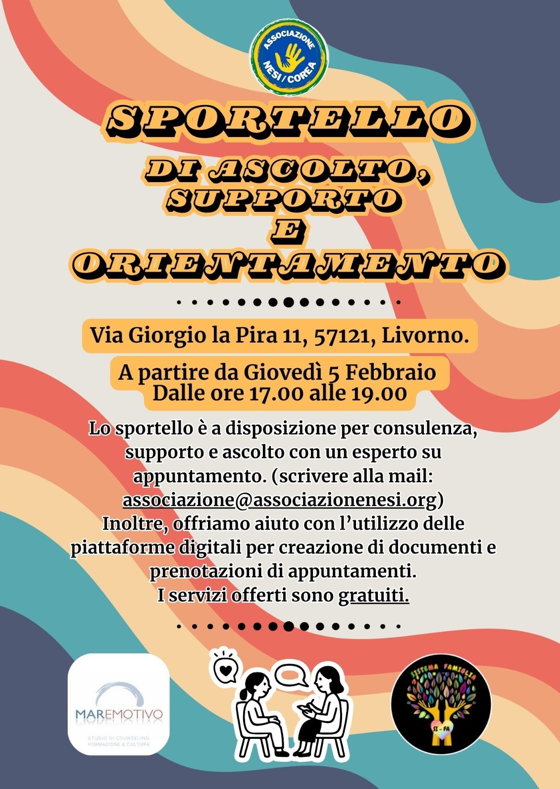Il servizio è gratuito. Per informazioni e prenotazioni per un appuntamento contattare l’email: associazione@associazionenesi.org